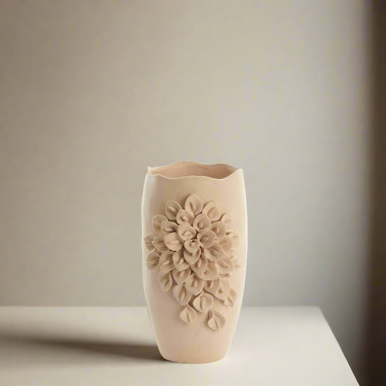 This elegant matt cream vase is a versatile piece for all seasons/ Its neutral colour palette makes it a sophisticated piece for showcasing your favourite flowers. With its sculpted leaves at the front , this is an unusal piece for creating a statement in your home.